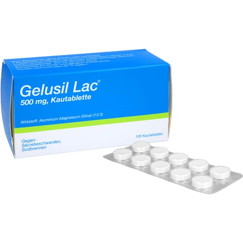 Gelusil Lac, 500 mg, Kautabletten. Wirkstoff: Aluminium-Magnesium-Silicat (1:2:3). Anwendungsgebiete: bei Säurebeschwerden verschiedener Art wie Sodbrennen oder saures Aufstoßen und zur unterstützenden Therapie bei Ulcus ventriculi oder Ulcus duodeni.Zu Risiken und Nebenwirkungen lesen Sie die Packungsbeilage und fragen Sie Ihre Ärztin, Ihren Arzt oder in Ihrer Apotheke.