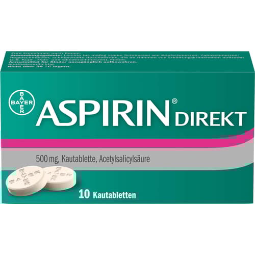 Aspirin Direkt 500 mg, Kautabletten. Wirkstoff: Acetylsalicylsäure. Anwendungsgebiete: bei leichten bis mäßig starken Schmerzen wie Kopfschmerzen, Zahnschmerzen, Regelschmerzen, schmerzhafte Beschwerden, die im Rahmen von Erkältungskrankheiten auftreten (z.B. Kopf-, Hals- und Gliederschmerzen) und bei Fieber.Zu Risiken und Nebenwirkungen lesen Sie die Packungsbeilage und fragen Sie Ihre Ärztin, Ihren Arzt oder in Ihrer Apotheke.