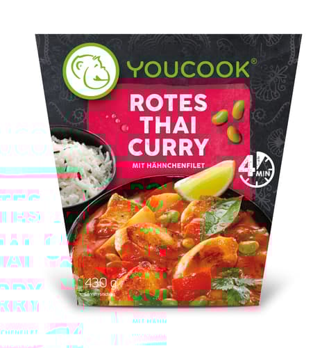Das YOUCOOK Rote Thai Curry aus Deutschland ist ein köstliches Fertiggericht für eine schnelle, exotische Mahlzeit. Es enthält zartes Hähnchenbrustfilet und frisches Gemüse in einer cremigen Kokos-Curry-Sauce, serviert mit einem Basmati-Wildreis-Mix. Die 430 g Packung bleibt 10 Tage frisch, wenn sie gekühlt bei +2°C bis +7°C gelagert wird.
