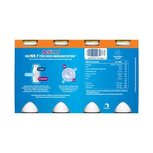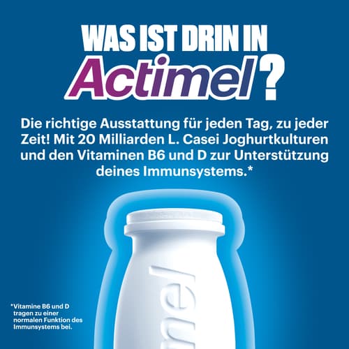 Actimel – Trink‘s als Teil deiner täglichen Routine! Jeder Tag ist eine neue Chance, um zu tun, was du wirklich willst & dabei aktiv zu sein. Actimel ist mit fermentierter Milch und natürlichen L.Casei Joghurtkulturen angereichert sowie den Vitaminen B6 und D. Die erfrischende Fruchtkombination aus Erdbeere, Orange, Pfirsich und Ananas von Actimel Multifrucht ist eine wahre Symphonie für deinen Gaumen und ein perfekter Start in den Tag. Natürlich steckt auch in Actimel Superfruits das Besondere von Actimel mit 20 Milliarden L. Casei Joghurtkulturen und den Vitaminen B6 und D.* *Vitamine B6 & D sind wichtig für zahlreiche Körperfunktionen.