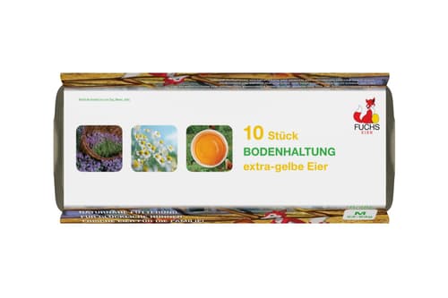 EU,Fuchs Bodenhaltung Eier in Größe M stammen aus tierfreundlicher Bodenhaltung (Stallhaltung mit Einstreu). Die Hennen erhalten ein Futter, das auch Kräuter enthält.
