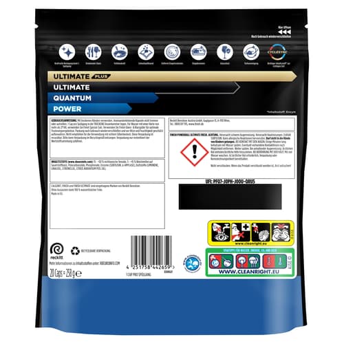 Dank der biologisch abbaubaren und zu 100% wasserlöslichen Folie ist kein Auspacken der einzelnen Caps nötig – für eine noch einfachere Anwendung. Im praktischen wiederverschließbaren, recycelbaren Standbodenbeutel.