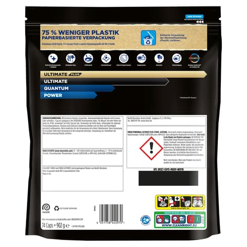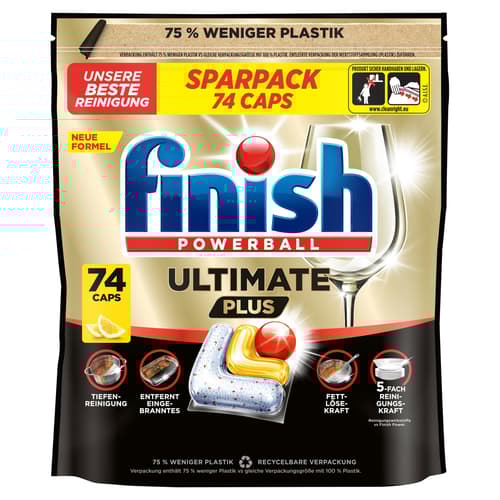 *Reinigungswirkstoffe vs. Finish Power ** Verpackung enthält 75% weniger Plastik vs gleiche Verpackungsgröße mit 100% Plastik.