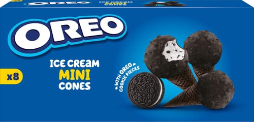 Oreo Mini Cones sind kleine Eiswaffelhörnchen mit Oreo-Geschmack im handlichen Format. Die Packung enthält 8 Portionen à 25 ml.