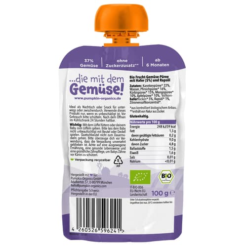 Der Pumpkin Organics Bio Gemüse-Quetschie mit Karotte, Pfirsich, Kürbis, Mango, Apfel und Hafer bringt mit 37% extra viel Gemüse mit und enthält dadurch nur 4,8g/100g Fruchtzucker, deutlich weniger Zucker als andere Quetschies auf dem Markt. In diesem Quetschie trifft eine milde Basis aus Karotte und Kürbis auf die fruchtige Note von Pfirsich und Mango. Diese feine Kombination überzeugt Kinder ab 6 Monaten und ist ein sanfter Einstieg in gemüsige Snacks. Bio Vollkornhaferflocken liefern zusätzliche Energie für zwischendurch und macht den Quetschie zum idealen Begleiter für unterwegs. Dieser Quetschie ist eine ideale Wahl für Eltern, die ihren Kindern gemüsereiche und fruchtzuckerarme Snacks aus 100% Bio Zutaten bieten möchten. Er enthält keinen Zuckerzusatz (enthält von Natur aus Zucker) oder Zusatzstoffe. Die Quetschie-Verpackung ist zudem recycelbar und einfach im gelben Sack zu entsorgen.