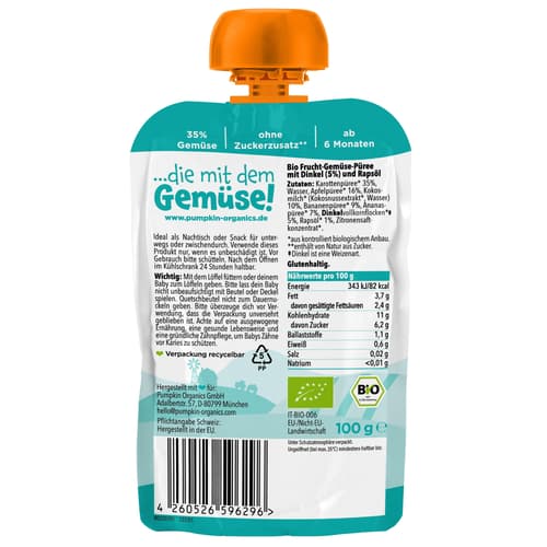 Der Pumpkin Organics Bio Gemüse-Quetschie mit Karotte, Apfel, Kokos, Banane, Ananas und Dinkel bringt eine neue, tropische Geschmackswelt in den Quetschbeutel. Mit 35% Karotte als Basis bleibt Gemüse im Fokus, während Kokosmilch, Banane und Ananas für eine fruchtig-tropische Note sorgen. Eine rundum ausgewogene Rezeptur mit nur 6,2g Fruchtzucker pro 100g. Die enthaltenen Bio Dinkelvollkornflocken sorgen für eine dickflüssigere Textur und geben Kindern ab 6 Monaten Energie für unterwegs. Dieser Quetschie ist ein idealer Snack ab dem Beikostalter, aber auch perfekt für ältere Kids, die bisher nur Frucht-Quetschies kennen. 100 % Bio Zutaten, ohne Zuckerzusatz und ohne Zusatzstoffe. Praktisch: Die Verpackung ist recycelbar und kann einfach im gelben Sack entsorgt werden.
