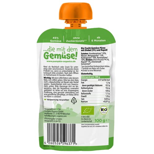 Der Pumpkin Organics Bio Gemüse-Quetschie mit Karotte, Mango, Kürbis, Birne und Dinkel ist mit einem Anteil von 45% besonders gemüsereich. Karotte und Kürbis bilden die gemüsige Basis, während Mango und Birne die Kombination harmonisch abrunden. Eine idealer Snack, der Babys ab 6 Monaten an gemüsige Snacks heranführt und auch ältere Kids überzeugt, die bisher vielleicht eher gemüseskeptisch waren. Dank des hohen Gemüseanteils enthält der Quetschie nur 4,8 g Zucker pro 100 g (enthält von Natur aus Zucker) und die enthaltenen Bio Dinkelvollkornflocken liefern zusätzliche Energie für zwischendurch. Einfach ideal als Snack für zwischendurch und unterwegs. Natürlich aus 100 % Bio Zutaten, ohne Zuckerzusatz (enthält von Natur aus Zucker) und ohne Zusatzstoffe. Zudem ist der Quetschbeutel recycelbar und kann ganz einfach im gelben Sack entsorgt werden.