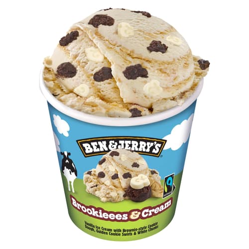 Entdecke Ben & Jerry's Brookieees & Cream Eiscreme, eine unwiderstehliche Kombination aus klassischem Vanilleeis, Brownie-Keksteig, goldenen Keksstrudeln und weißen Schokoladenstückchen. Dieses gefrorene Vergnügen, inspiriert von der beliebten 'Brookie'-Kombination, wird mit Fairtrade-zertifizierten Zutaten hergestellt und kommt im praktischen 465 ml Becher direkt aus den Niederlanden zu dir nach Hause. Ein wahrer Genuss!