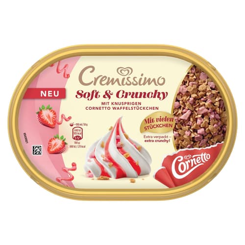 Cremissimo Soft & Crunchy Erdbeere kombiniert löffelzartes Eis mit Erdbeer-Sauce und knusprigen Cornetto-Waffelstückchen. Ein Extra-Fach hält die Toppings getrennt und sorgt beim Portionieren für individuell dosierbaren Crunch.