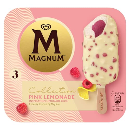 Magnum Euphoria Pink Lemonade kombiniert Zitroneneis und Himbeersorbet, umhüllt von weißer Schokolade. Ein Topping aus Knisterstückchen sorgt für eine besondere Textur.