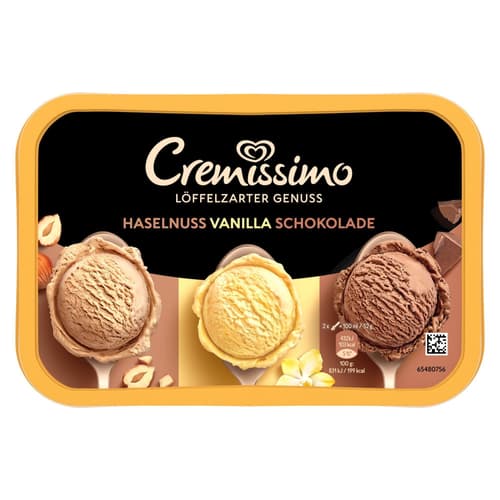 Cremissimo Haselnuss, Vanille und Schokolade vereint drei Eissorten in einem Becher. Die Textur ist löffelzart und eignet sich zum Portionieren.