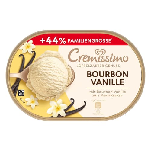 Cremissimo Bourbon Vanille ist ein Vanilleeis in der 1300-ml-Familiengröße mit 44% mehr Inhalt als die 900-ml-Packung. Die Vanille stammt aus Madagaskar und ist Rainforest-Alliance-zertifiziert.