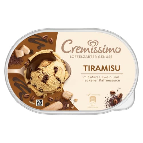 Cremissimo Tiramisu ist ein cremiges Eis mit Tiramisu-Geschmack, verfeinert mit Marsala-Note, Kaffee-Gebäck-Stückchen und Kaffeesauce. Alkoholgehalt: 0 Vol. -%.