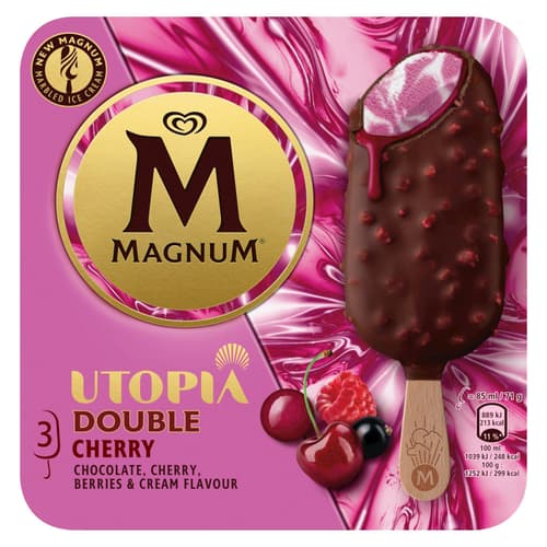 Magnum Double Cherry bietet ein Duo aus Eis mit Schwarze Johannisbeere-Himbeere und Rahmeis. Umhüllt ist es von Sauerkirschensauce, knackiger Milchschokolade und Zuckerstückchen mit Fruchtgeschmack.