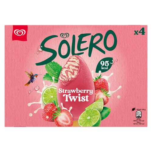 Solero Strawberry Twist ist ein Eis am Stiel mit Erdbeergeschmack und einem Limetten-Twist. Die spiralförmige Kombination verbindet cremiges Milcheis mit einer fruchtigen Erdbeerschicht.
