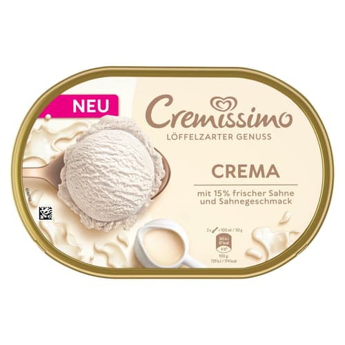 Deutschland,Cremissimo Crema ist ein cremiges Eis mit 15% frischer Sahne in der typischen Tupfenabfüllung. Es eignet sich für alle, die sahnigen Geschmack und eine weiche Textur mögen.
