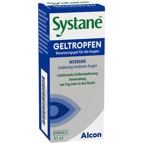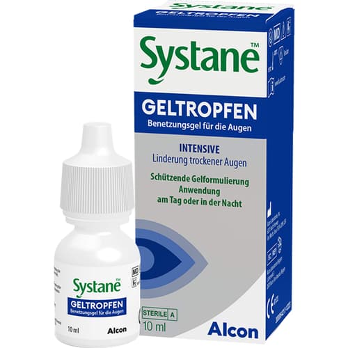 SYSTANE GELTROPFEN are gel-like lubricating drops that effectively relieve moderate to severe dry eye symptoms. They provide intensive moistening for both day and night use, protect cells, and are also suitable for contact lens wearers. This 10 ml bottle stays fresh for three months after opening, offering long-lasting relief.