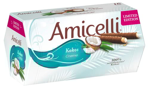 Amicelli Kokoscreme verbindet knusprige Waffelröllchen mit einer zarten Cremefüllung und einer Hülle aus Milchschokolade. Die Summer Edition greift dabei eine Kokos-Note auf.