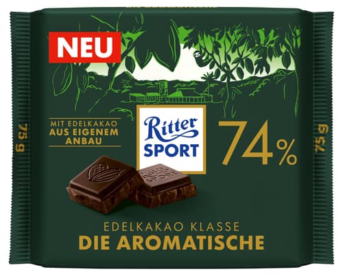 Ritter Sport Die Aromatische 74% ist eine dunkle Tafelschokolade mit intensivem Kakaoprofil und fein ausbalancierter Milde. Sie richtet sich an alle, die Zartbitterschokolade mit klarer Aromatik bevorzugen.