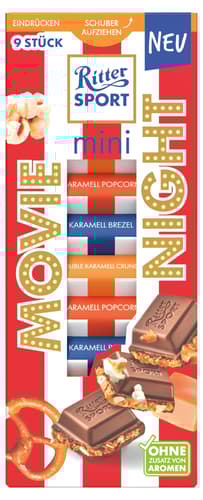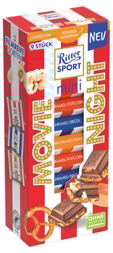 Ritter Sport Mini 9er Movie Night Turm kombiniert mehrere Mini-Tafeln für den Snackmoment beim Film. Enthalten ist auch die Sorte 81% Dark Chocolate Extra Intense mit Kakao aus Ghana.