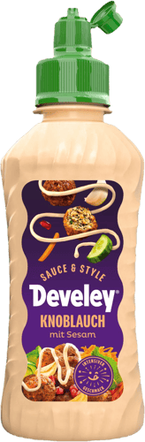 Zutaten: Trinkwasser, Rapsöl, Zucker, 8,5% Knoblauch, Branntweinessig¹, Zitronensaft aus Zitronensaftkonzentrat, 3% SESAM, Stärke, 2% SESAMÖL, Speisesalz, Gewürze, MILCHEIWEIß, Verdickungsmittel (Guarkernmehl). (¹für AT: Weingeistessig / für CH: Tafelessig)