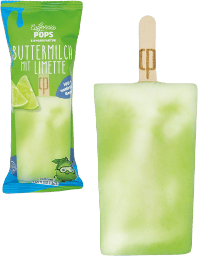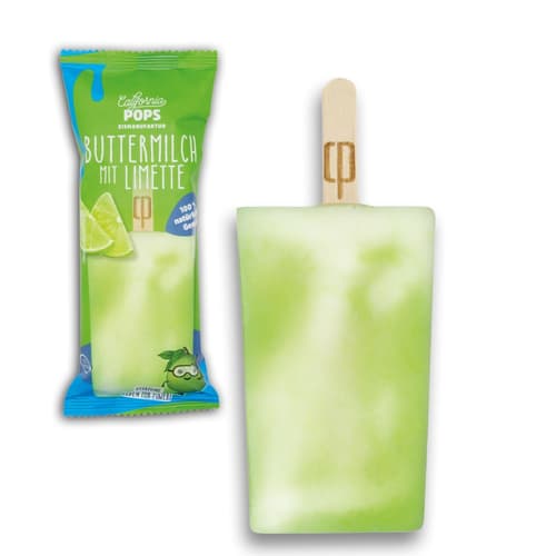 California Pops Buttermilch Limette kombiniert Buttermilcheis mit einem Limetten-Sorbet. Die Kombination ist cremig und zugleich frisch.