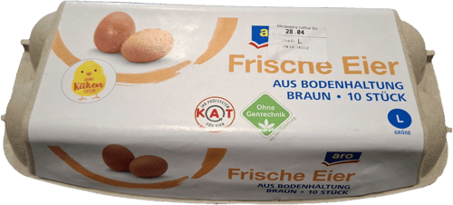 Diese braunen Eier aus deutscher Bodenhaltung kommen im 10er-Pack und decken die Gewichtsklassen S bis L ab. Sie sind der Qualitätsklasse A zugeordnet und tragen den Erzeugercode 2-DE.