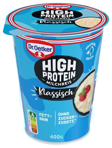 Cremig lecker! Der Dr. Oetker High Protein Milchreis ist ein Hochgenuss für deine ernährungsbewusste Auszeit. Mit 30g Protein pro Becher, ohne Zuckerzusatz* und fettarm ist er die perfekte Ergänzung zu einem aktiven Lifestyle. Der Milchreis verspricht nicht nur pur, sondern auch mit Toppings, wie Beeren oder anderen Früchten, vollen Genuss.