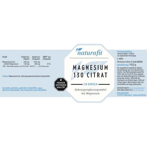 naturafit Magnesium 130 Citrat Kapseln, 120 St. Kapseln