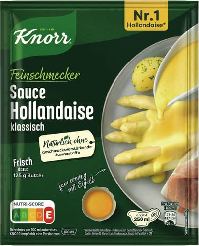 Mit der Feinschmecker Sauce Hollandaise klassisch von Knorr wird das Spargelessen zum unvergesslichen Erlebnis. Der beliebte Klassiker zur Spargelsaison ist ein zart-cremiger Saucengenuss mit feinem Geschmack und passt neben Spargel hervorragend zu Brokkoli und Fisch. Durch die Zugabe von feiner Butter wird die Sauce zu einem besonderen Genuss für jeden Feinschmecker. Zubereitung: 1) Beutelinhalt mit dem Schneebesen in 125 ml kaltes Wasser einrühren. Unter Rühren aufkochen. 2) Bei schwacher Hitze 125 g gewürfelte Butter darunter schlagen, bis sie geschmolzen ist. Saucen für Feinschmecker: Die Knorr Feinschmecker Saucen bieten für jeden Geschmack die passende Variante: Sauce Hollandaise zu Spargel oder Gemüse, 3 Pfeffersauce zu Steak und Kurzgebratenem oder Dillsauce für Fischgerichte. Im Handumdrehen zubereitet verfeinern die Saucen jedes Gericht und begeistern somit die ganze Familie. Mmmhh, lecker! Kennen Sie schon die vielen weiteren Produkte von Knorr? Dank unserer Fix-Produkte, Brühen, Saucen, Fertiggerichten, Suppen und Salatdressings gelingt jedes Gericht garantiert mit wenigen Handgriffen. Schnell und einfach erhalten so authentische Mahlzeiten ihren typischen Geschmack – egal, ob abwechslungsreiche vegetarische oder vegane Küche, herzhafte Fleischgerichte oder leckere Gemüsevariationen. Dabei ist es die Komposition ausgewählter hochwertiger Zutaten, die jedes Knorr Produkt besonders macht. Knorr verarbeitet nur sorgfältig schonend getrocknete Zutaten, denn das Trocknen ist eine der ältesten Methoden, um Lebensmittel natürlich haltbar zu machen. Da der Geschmack und die Nährstoffe der frischen Zutaten weitgehend erhalten bleiben, passen Lebensmittel aus getrockneten Zutaten perfekt in unseren stressigen Alltag. Essen mit Knorr ist unkompliziert und sorgt darüber hinaus für ein gutes Gefühl: Über 90 Prozent der Zutaten kommen heute schon aus nachhaltigem Anbau. Denn wir bei Knorr glauben, dass die Verwendung nachhaltig angebauter und beschaffter Zutaten einen großen Unterschied für den Geschmack unserer Produkte, das Wohlbefinden der Landwirte und die Zukunft des Planeten macht. Knorr – Geschmack mit gutem Gefühl.