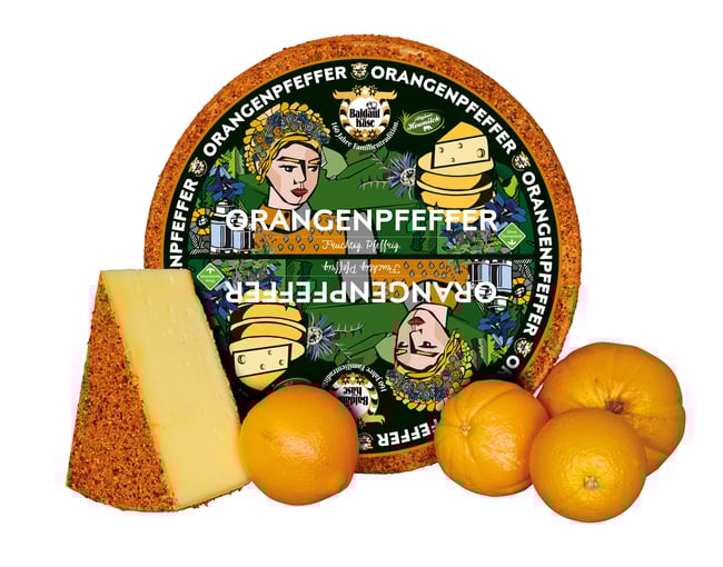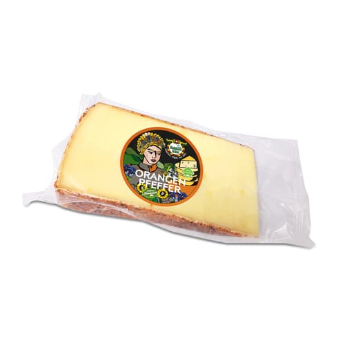 MILCH (Heumilch g.t.S.), Salz, KÄSEREIKULTUREN, tierisches Lab, Naturrinde mit Orangenpfeffermischung (Pfeffer, Bio-Dextrose, Orangenschalen, Gemüsepaprika, Gewürzextrakte)