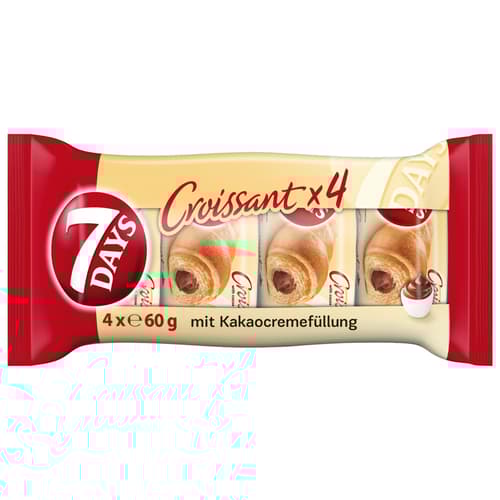 Wenn es morgens ruckzuck gehen soll, dann sind die 7Days Croissants genau richtig. Denn die leckeren Hörnchen sind herrlich soft im Biss und überraschen im Inneren mit einer aromatischen Kakao-Creme. Naschen Sie ihn als köstliche Zwischenmahlzeit in der Schule, im Job oder unterwegs.