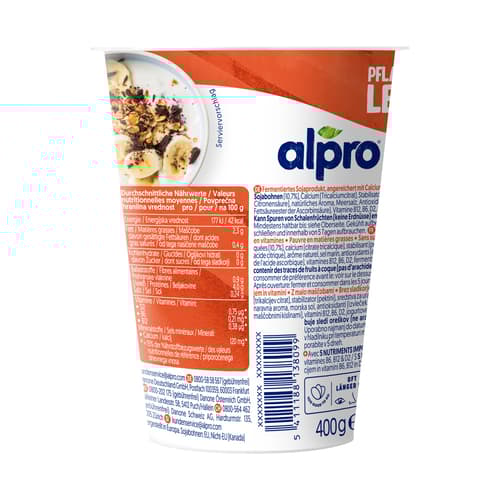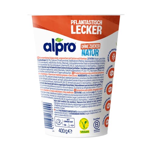EigenschaftWertGröße500 g BecherHauptzutatSojamilch (Sojabohnen, Wasser)Frei vonZucker, Laktose, Gluten, Gentechnik.Angereichert mitCalcium, Vit. B12 & D2KulturLactobacillus bulgaricus, Streptococcus thermophilus