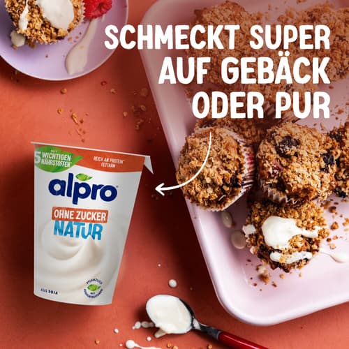 Genieße dir dein veganes Frühstück, deinen Snack oder deine Mahlzeit – mit Alpro Soja-Joghurtalternative Natur ohne Zucker bist du bestens versorgt und tust dir und der Umwelt etwas Gutes!