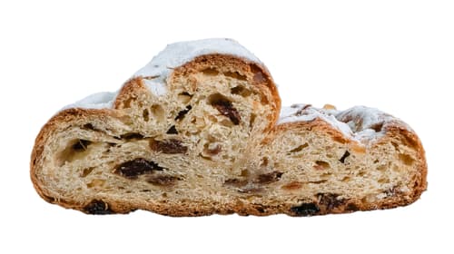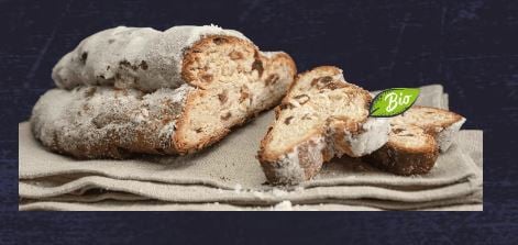 Zutaten: Weizenmehl*, Sultaninen*, Butter* 16%, Vollmilch*, Zucker*, Orangeat* (Maissirup*, Orangenschalen* 30%), Zitronat* (Zitronenschalen* 57%, Glukose-Fruktose-Sirup*, Säuerungsmittel: Zitronensaft*), Puderzucker* (Rohrohrzucker*, Tapiokastärke*), Hefe, Mandel*, Marzipan* mit Rohrohrzucker, Rum*, Meersalz, Bourbon Vanille Aroma* (Aromaextrakte* (Bourbon Vanille), Wasser, Alkohol*, Karamell*, Verdickungsmittel Xanthan), Zitronen Aroma* (Aromaextrakte* (Zitrone), Wasser, Alkohol*, Verdickungsmittel Xanthan), Weizenkleber*, Guarkernmehl*, Sojalecithin* E322, Calciumcarbonat E170, Ascorbinsäure E300.