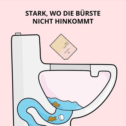 1. Je nach Verschmutzung einen oder mehrere Tabs direkt im WC* auflösen und mindestens 1 Stunde einwirken lassen. Für besonders hartnäckige Ablagerungen in der Toilette, kannst du den Tab auch über Nacht einwirken lassen. Zusätzlich die WC Bürste nutzen.