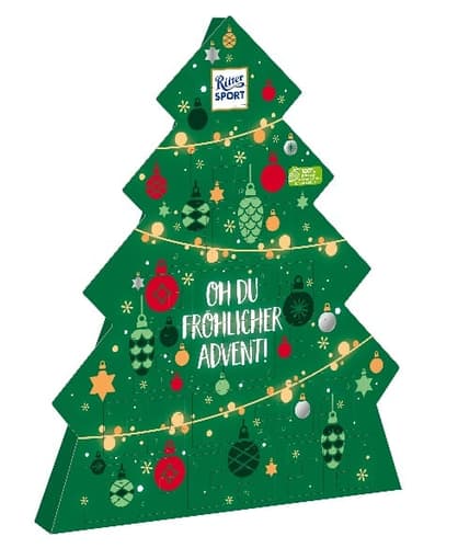 Der tägliche Schokogenuss. Der Ritter Sport Adventskalender beherbergt hinter jedem Türchen köstliche Schokowürfel, die nicht zuletzt mit ihrer üppigen Füllung überzeugen. Mit der unverkennbaren Weihnachtsbaumkontur macht dieser Adventsbegleiter an jeder Wand eine gute Figur.