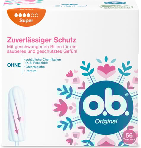 Die o.b.® Original Super Tampons mit geschwungenen Rillen leiten die Flüssigkeit effizient ins Innere des Tampons und die StayDry Technologie sorgt für ein trockenes Rückholbändchen sowie ein sauberes Gefühl. Die Original Super Tampons von o.b.® eignen sich bestens für starke Tage. Zudem sind die Original Tampons gynäkologisch getestet, enthalten einen 100% pflanzlich basierten Tamponkern und sind frei von schädlichen Chemikalien (z.B. Pestizide), Chlorbleiche und Parfüm.