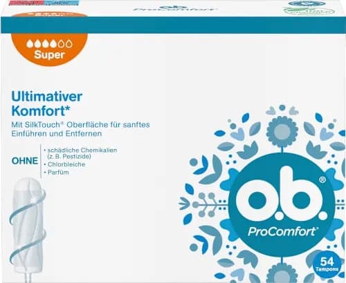 Die o.b.® ProComfort® Tampons mit Dynamic Fit™ Technologie und SilkTouch® Oberfläche sorgen für ultimativen Komfort* (*innerhalb des o.b.® Sortiments) und zuverlässigen Schutz: Die 3D Entfaltung sorgt für ein natürliches Anpassen des Tampons an den Körper und die einzigartigen und ineinander greifenden Rillen helfen die Flüssigkeit effizient im Inneren des Tampons zu verteilen. Die SilkTouch® Oberfläche sorgt für ein besonders sanftes Einführen und Entfernen. Zudem sind die o.b.® ProComfort® Tampons gynäkologisch getestet, enthalten einen 100% pflanzlich basierten Tamponkern und sind frei von schädlichen Chemikalien (z.B. Pestizide), Chlorbleiche und Parfüm.