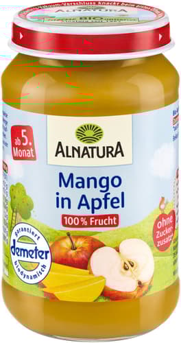Eine fein pürierte Zwischenmahlzeit aus hundert Prozent Bio-Frucht: Alnatura Apfel mit Mango ist glutenfrei und wird ohne Zuckerzusatz hergestellt (Zutaten enthalten von Natur aus Zucker).