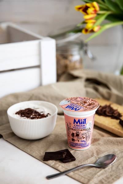 Miil cremiger Joghurt Stracciatella. Er hat einen leicht säuerlichen Geschmack, eine cremige Konsistenz und enthält lebende Kulturen.
