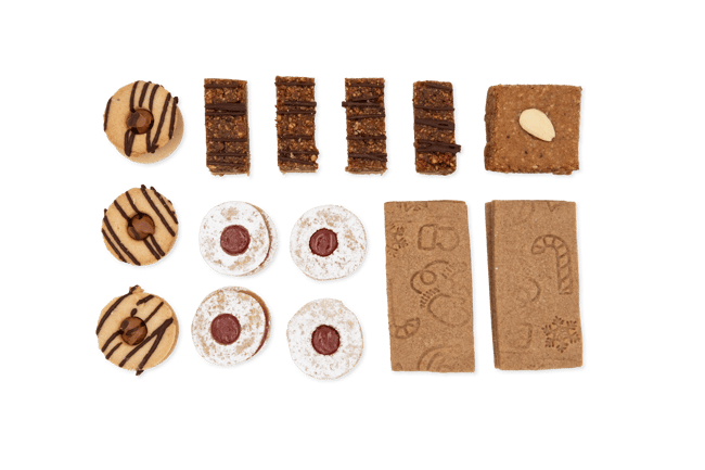 Glutenfreie und vegane Karamellkekse, Kokosmakronen, Mürbeteigkekse mit Johannisbeerkonfitüre und gestiftelte Mandeln mit Zartbitter-Kuvertüre. Verpackt in Geschenkbox.