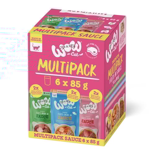 Das WOW CAT Nassfutter Multipack aus Deutschland bietet hochwertiges Alleinfuttermittel für erwachsene Katzen, angereichert mit extra viel Sauce. Es enthält die beliebten Sorten Huhn, Rind und Lachs. Dieses Futter ist frei von künstlichen Konservierungs- und Geschmacksverstärkern sowie Getreidezusatz, ideal für eine ausgewogene Ernährung Ihrer Katze. Jedes Multipack enthält 6x85g.