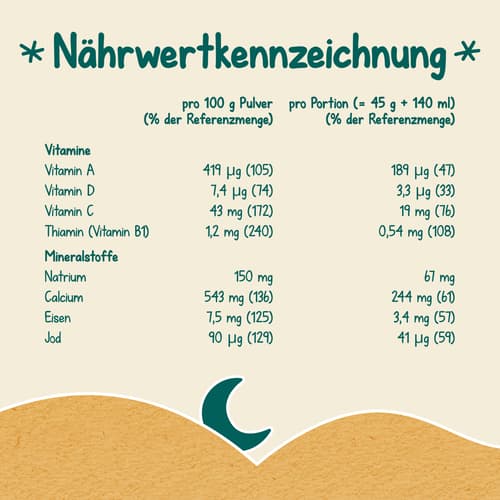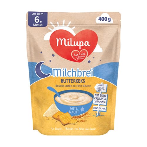 Für dein Baby ist ein erholsamer Schlaf für einen guten Start am nächsten Tag wichtig. Unser Gute Nacht Butterkeks ist auf die Bedürfnisse von Babys nach dem 6. Monat abgestimmt und enthält neben wertvollem Getreide von speziell geprüften Feldern das Gute aus der Milch. Damit liefert unser Milchbrei Vitamine und Mineralstoffe, wie Eisen, Calcium und Vitamin D und begleitet die natürliche Entwicklung deines Kindes - Schritt für Schritt. Unser Milchbrei ist lecker, frei von Konservierungs- und Farbstoffen (laut Gesetz) & ohne Zuckerzusatz (enthält von Natur aus Zucker). Einfach mit Wasser zubereiten - ideal für die letze Mahlzeit am Abend.