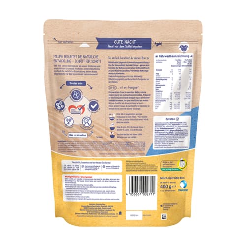 Getreide (33,3%) (HARTWEIZENGRIEß (18,3%), WEIZEN** (13,2%), HAFER**(0,3%), Reis (0,3%), Hirse**(0,3%), GERSTE** (0,3%), Mais (0,3%), ROGGEN (0,3%)), MAGERMILCHPULVER (29%), demineralisiertes Molkenpulver (aus MILCH) (15%), Butterkeksmehl (15%) (WEIZENMEHL, BUTTER, MAGERMILCHPULVER, Backtriebmittel (Ammoniumcarbonat), Säuerungsmittel (Citronensäure)), pflanzliche Öle (Kokosnuss-, Palm-, Raps-, Sonnenblumenöl, Emulgator: SOJALECITHIN), Mineralstoffmischung (Calciumcarbonat, Eisendiphosphat, Kaliumjodid), Vitaminmischung (Vitamin C, Vitamin B1, Vitamin A, Vitamin D), Vanillearoma. ** Vollkorngetreide 14,1%"