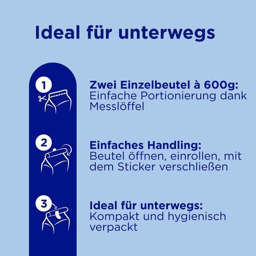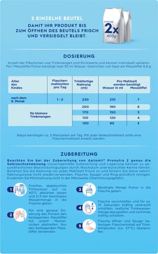Angebrochenen Innenbeutel stets gut verschließen und innerhalb von 4 Wochen aufbrauchen. Vor Wärme geschützt und trocken lagern. 1. Frisches, abgekochtes Trinkwasser auf ca. 40 °C abkühlen lassen und 2/3 der benötigten Wassermenge in die Flasche geben. 2. Für eine genaue Dosierung des Pulvers den beiliegenden Messlöffel am Abstreifer abstreifen. Nur den beiliegenden Messlöffel verwenden. 3. Benötigte Menge Pulver in die Flasche geben. Den Messlöffel im Löffelhalter verstauen. 4. Flasche verschließen und für ca. 10 Sekunden kräftig senkrecht schütteln, restliche Trinkwassermenge dazugießen und nochmals kräftig schütteln. 5. Flasche öffnen und Sauger befestigen. Flascheninhalt auf Trinktemperatur (ca. 37°C) überprüfen.