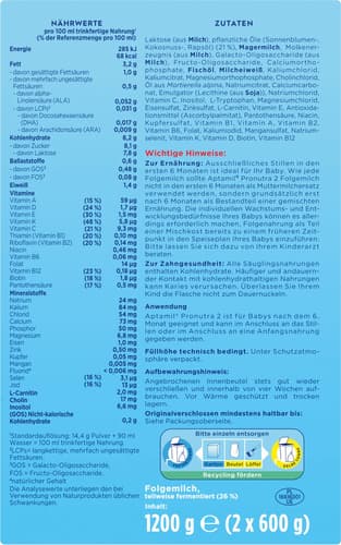 Zutaten: Lactose (aus MILCH), pflanzliche Öle (Palm-, Kokosnuss-, Raps-, Sonnenblumenöl), MAGERMILCH, demineralisierte Molke (aus MILCH), Galactooligosaccharide (aus MILCH), Molkenkonzentrat (aus MILCH), Fructooligosaccharide, Calciumorthophosphat, ***FISCHÖL, Molkenprotein (aus MILCH), Kaliumchlorid, Kaliumcitrat, Magnesiumorthophosphat, ***Öl aus Mortierella alpina, Calciumcarbonat, Cholinchlorid, Natriumcitrat, Vitamin C, Emulgator (SOJALECITHIN), Natriumchlorid, Taurin, Inositol, Magnesiumchlorid, Eisen-II-sulfat, L-Tryptophan, L-Carnitin, Zinksulfat, Nucleotide (Natriumsalze von Cytidin, Uridin-, Adenosin-, Inosin-, Guanosin-5-Monophosphat), Antioxidationsmittel (Ascorbylpalmitat), Niacin, Pantothensäure, Vitamin E, Kupfersulfat, Vitamin A, Vitamin B2, Vitamin B1, Vitamin B6, Kaliumjodid, Folsäure, Mangan-II-sulfat, Vitamin K, Natriumselenit, Vitamin D, Biotin, Vitamin B12