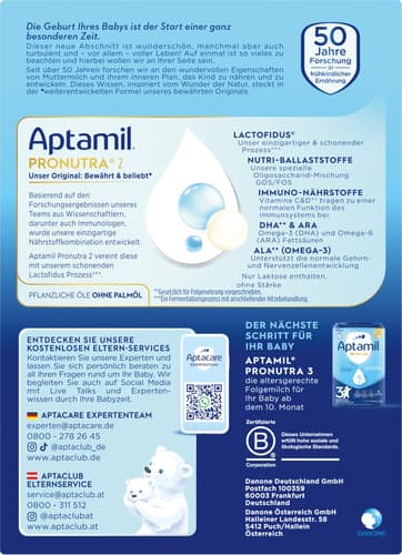 Unser Wissen, basierend auf 50 Jahren Muttermilchforschung: Aptamil Pronutra 2 vereint unsere einzigartige Nährstoffkombination mit unserem schonenden Lactofidus Prozess und stärkt schon die kleinsten Immunsysteme* mit Vitamin C und D**. Unsere Folgenahrung ist optimal auf die Ernährungsbedürfnisse deines Babys ab dem 6. Monat als Bestandteil einer gemischten Ernährung mit Beikost abgestimmt. Sie enthält pflanzliche Öle ohne Palmöl und keine Stärke.