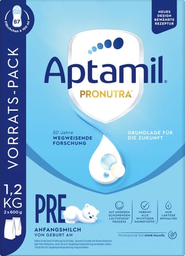 Unser Original* im praktischen 1,2 kg Vorratspack. Aptamil Pronutra Pre vereint unsere einzigartige Nährstoffkombination mit unserem schonenden Lactofidus®️ Prozess. Unsere Anfangsmilch ist speziell auf die Ernährungsbedürfnisse eures Babys von Geburt an abgestimmt und ist auch zum Zufüttern beim Stillen geeignet. Aptamil Pronutra Pre enthält pflanzliche Öle ohne Palmöl.