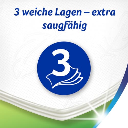 Die perfekte kombination aus Weichheit, Stärke und Saugfähigkeit. 100% recycelbare Verpackung mit praktischen Tragegriff. 8x150Blatt 3-lagig